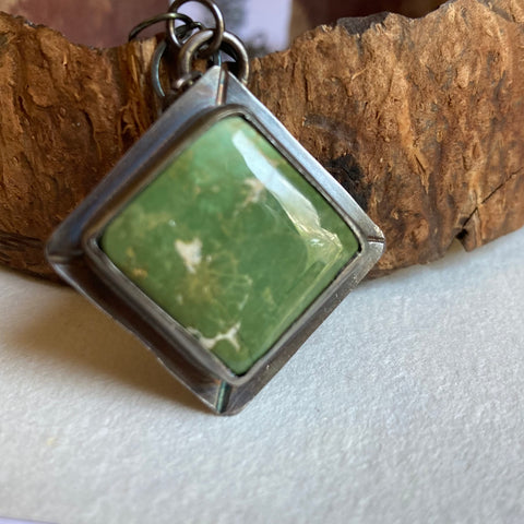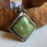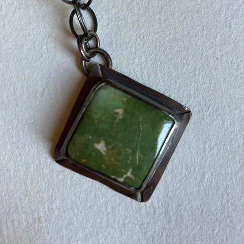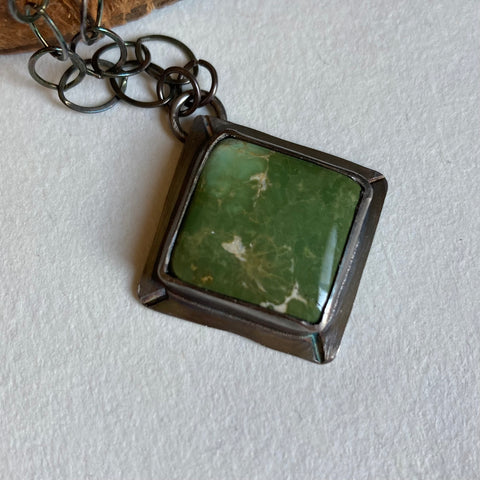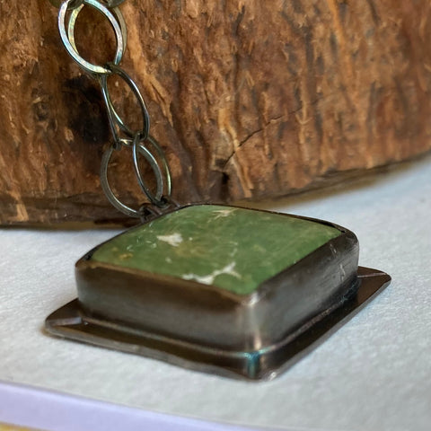 Gorgeous green Roystone mine turquoise, set on its point in handcrafted sterling silver. The silver has been oxidized and then polished for a beautiful finish. The chain is a wide link, 18” long and finished with a lobster claw clasp.