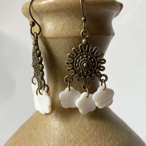 Sweet antique brass flower earrings with mother of pearl flowers. Perfect earrings for your favorite festival or summer date night outfits. They measure about 2”.